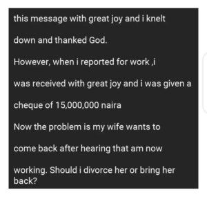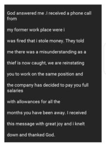 However God turned situations around after six months when the Office of the Former Workplace where he was Sacked Contacted him apologizing saying it was a Misunderstanding while offering him a Cheque of Fifteen Million naira For Compensation.